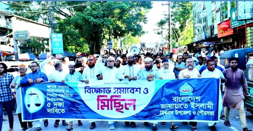 বাংলাদেশ জামাতে ইসলামির কেন্দ্র ঘোষিত জুলাই জাতীয় সনদের ভিত্তিতে আগামী ফেব্রুয়ারিতে জাতীয় নির্বাচন আয়োজন, নির্বাচনে উভয় কক্ষে পিআর পদ্ধতি চালু করা, অবাধ, সুষ্ঠু ও গ্রহণযোগ্য নির্বাচনের লক্ষ্যে লেভেল প্লেয়িং ফিল্ড নিশ্চিত করা, ফ্যাসিস্ট আওয়ামী লীগ সরকারের সকল জুলুম-নির্যাতন, গণহত্যা ও দুর্নীতির বিচার দৃশ্যমান করা এবং স্বৈরাচারের দোসর জাতীয় পার্টি ও ১৪ দলের কার্যক্রম নিষিদ্ধ করা-এই ৫ দফা বাস্তবায়নের দাবিতে বিশ্বনাথ উপজেলা ও পৌর জামায়াত আয়োজিত বিক্ষোভ সমাবেশে প্রধান অতিথির বক্তব্যে তিনি এসব কথা বলেন।