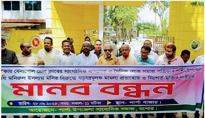 রোববার(২৮ সেপ্টেম্বর) সকাল ১১টায় শার্শা উপজেলা পরিষদের সামনে এ মানববন্ধনে প্রধান অতিথি ছিলেন দৈনিক লোকসমাজের ভারপ্রাপ্ত সম্পাদক আনোয়ারুল কবির নান্টু।
