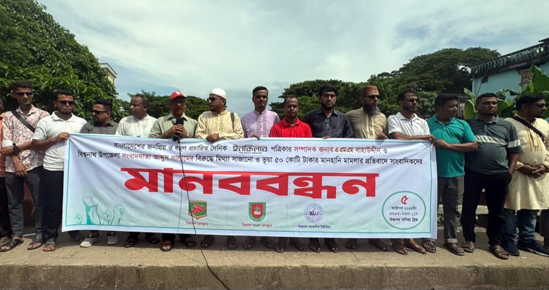 বিশ্বনাথে সাংবাদিকের বিরুদ্ধে মামলার প্রতিবাদে বিশ্বনাথে তিন সাংবাদিক সংগঠনের মানববন্ধন