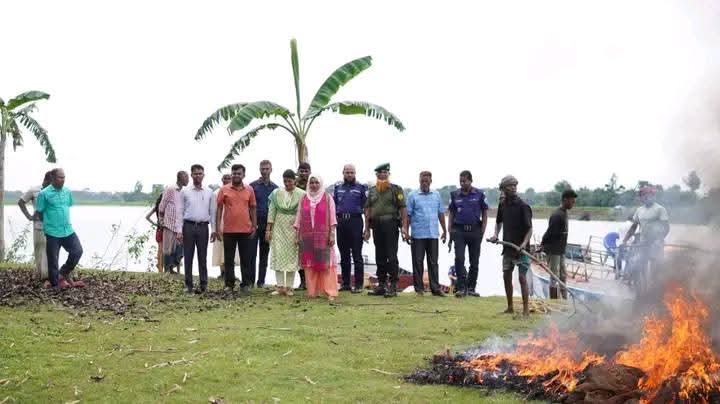 শনিবার (৫ অক্টোবর ২০২৫) সকাল ৮টা থেকে দুপুর ১২টা ৩০ মিনিট পর্যন্ত উপজেলার ধোপাযান চলতি নদী ও গজারিয়া নদীতে এ যৌথ অভিযান পরিচালনা করা হয়।