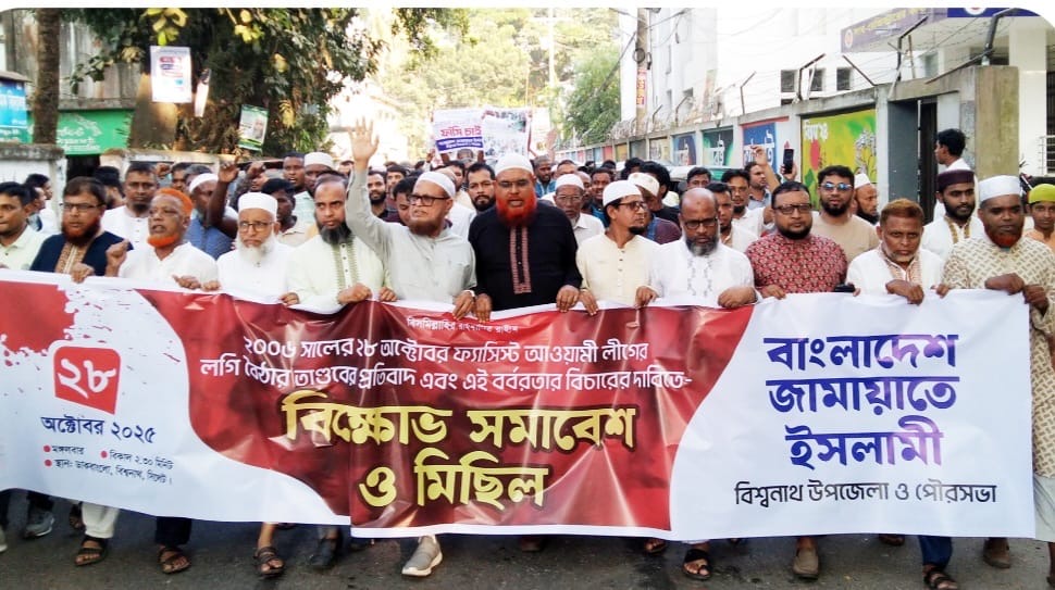 মঙ্গলবার ২৮শে অক্টোবর বিকেল বিশ্বনাথ উপজেলা ও পৌর জামাতের উদ্যোগে বিক্ষোভ সমাবেশ ও মিছিল অনুষ্ঠিত হয়েছে। পৌর শহরের ডাকবাংলো প্রাঙ্গণ থেকে বিক্ষোভ মিছিল শুরু হয়।