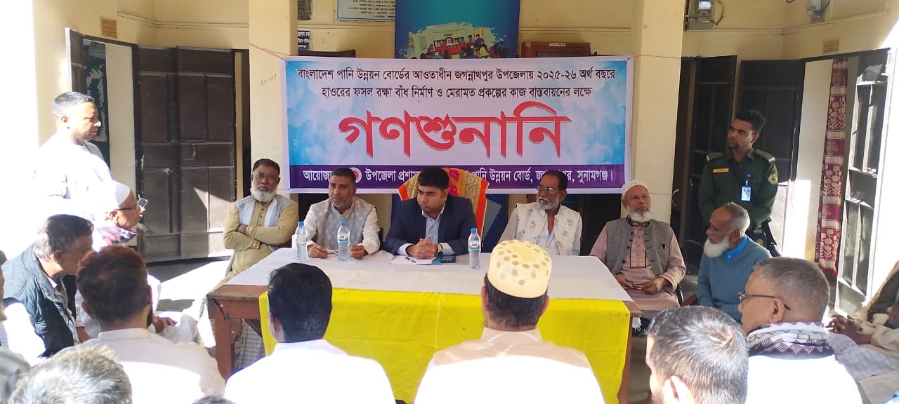 সুনামগঞ্জের জগন্নাথপুর উপজেলায় ২০২৫-২৬ অর্থবছরের হাওরের ফসল রক্ষা বাঁধ নির্মাণ ও মেরামত প্রকল্প বাস্তবায়ন উপলক্ষে গণশুনানি অনুষ্ঠিত হয়েছে।
