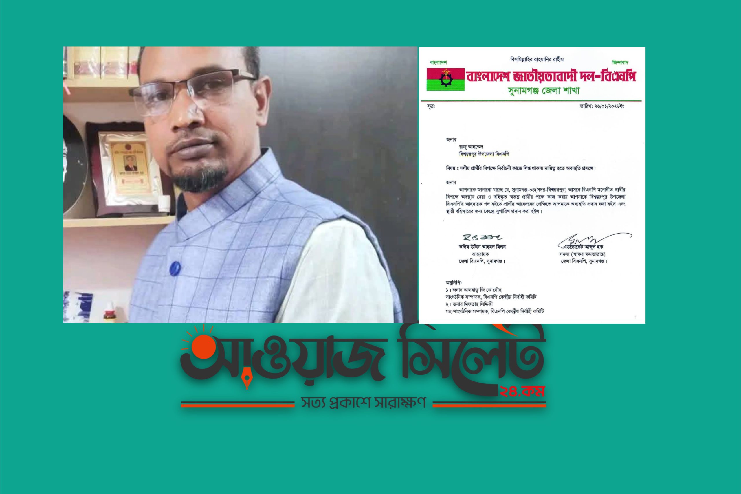 সুনামগঞ্জ-৪ আসনে বিএনপি মনোনীত প্রার্থীর বিপক্ষে নির্বাচনী কাজে লিপ্ত থাকায় বিশ্বম্ভরপুর উপজেলা বিএনপি আহবায়ক রাজু আহম্মেদকে দায়িত্ব হতে অব্যহতি দেওয়া হয়েছে।