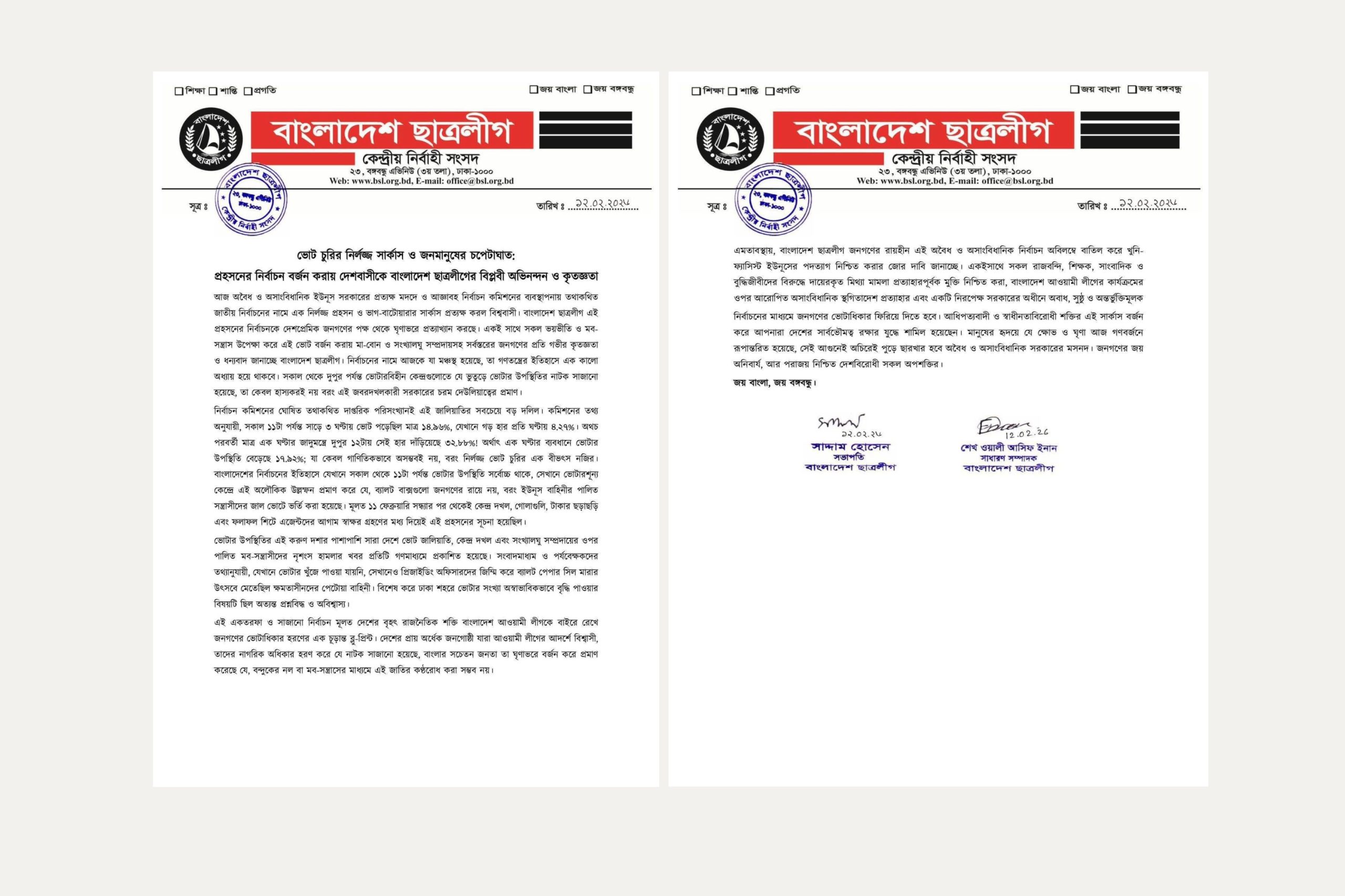 তথাকথিত জাতীয় নির্বাচনকে “প্রহসন” আখ্যা দিয়ে তা প্রত্যাখ্যান করেছে বাংলাদেশ ছাত্রলীগ। সংগঠনটির পক্ষ থেকে দেওয়া এক বিবৃতিতে বলা হয়েছে, এই নির্বাচন ছিল “অবৈধ ও অসাংবিধানিক” এবং জনগণ স্বতঃস্ফূর্তভাবে তা বর্জন করেছে।
