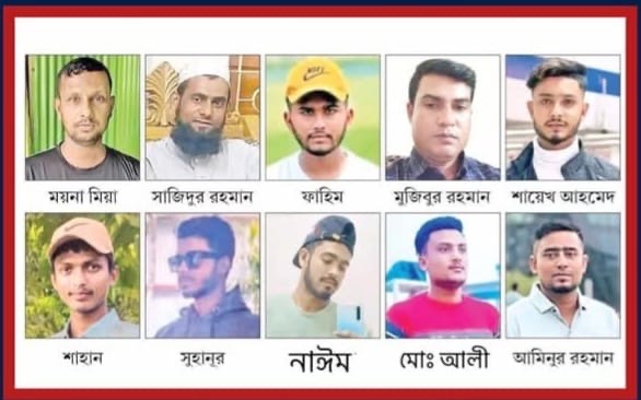 নিহতরা হলেন: জগন্নাথপুরের চিলাউড়া গ্রামের সোহানুর রহমান , টিয়ারগাঁওয়ের শায়েখ আহমেদ, চিলাউড়া কবিরপুরের মো. নাঈম, পাইলগাঁওয়ের আমিনুর রহমান, ইছগাঁওয়ের মোহাম্মদ আলী। দিরাই উপজেলার তারাপাশা গ্রামের আবু সাঈদ সরদারের ছেলে নুরুজ্জামান সরদার ময়না (৩০), আব্দুল গণির ছেলে সাজিদুর রহমান (২৮), ইসলাম উদ্দিনের ছেলে শাহান মিয়া (২৫), রনারচর গ্রামের আব্দুল মালেকের ছেলে মুজিবুর রহমান (৩৮), বাসুরি গ্রামের মোঃ সুহানুর রহমান (৩২),দোয়ারাবাজার উপজেলার কবিরনগর গ্রামের ফয়েজ উদ্দিনের ছেলে আবু ফাহিম, এদের পরিচয় স্থানীয় সূত্রে পাওয়া গেছে।