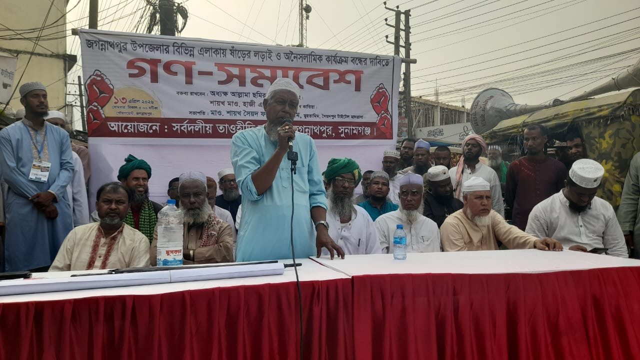 বিক্ষোভ মিছিলটি উপজেলার প্রধান প্রধান সড়ক প্রদক্ষিন করে পৌর পয়েন্টে এসে এক গণসমাবেশে মিলিত হন। সৈয়দপুর টাইটেল মাদ্রাসার মুহতামীম মাওলানা শায়খ সৈয়দ ফখরুল ইসলাম এর সভাপতিত্বে বাংলাদেশ খেলাফত মজলিস সুনামগঞ্জ জেলা শাখার সাধারন সম্পাদক মাওলানা সাইফুর রহমান সাজাওয়ার ও পৌর জামায়াতের সভাপতি ওয়ালি উল্লাহর যৌথ পরিচালনায় বক্তব্য রাখেন, শায়খ মাওলানা হাজী এমদাদুল্লাহ শায়খে কাতিয়া। ইকড়ছই আলিম মাদ্রাসার সিনিয়র শিক্ষক আকবর হোসেন জামী, জগন্নাথপুর সাংবাদিক ফোরামের আহবায়ক কমিটির সদস্য, ভোরের কাগজ পত্রিকার জগন্নাথপুর প্রতিনিধি রিয়াজ রহমান, খোলা কাগজ পত্রিকার জগন্নাথপুর প্রতিনিধি আল আমিন জগন্নাথপুর সাংবাদিক প্রেসক্লাবের সাধারণ সম্পাদক সানোয়ার হোসেন সুনু, সিনিয়র সাংবাদিক জহিরুল ইসলাম লাল মাওলানা হাফিজুর রহমান, হযরত মাওলানা হাফিজ আমিরুল ইসলাম, মাওলানা আশিকুর রহমান মামুন, মাওলানা সাঈদ আহমদ, মাওলানা ফজলুর রহমান, হাফিজ মাওলানা ইয়াহিয়া আহমদ, নুরুজ্জামানসহ বিভিন্ন রাজনৈতিক ও সমাজিক সংগঠনের নেতৃবৃন্দ।